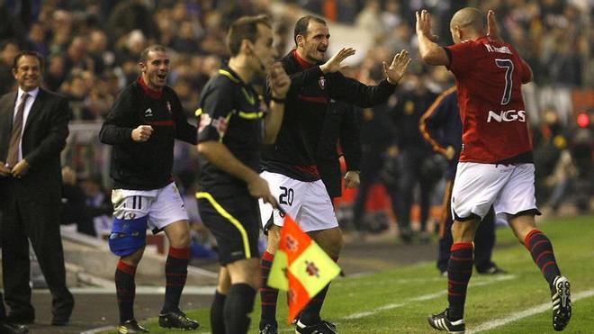 La salida de Aranda en la segunda parte revolucionó el juego de Osasuna, que pasó de dominado a dominador. Y, para completar la faena, el jugador malagueño fue el autor del gol del empate, que tan improbable parecía en el descanso. En la imagen, Aranda corre al banquillo a celebrar el último tanto del partido con Soriano y Pandiani. Foto: Mikel Saiz