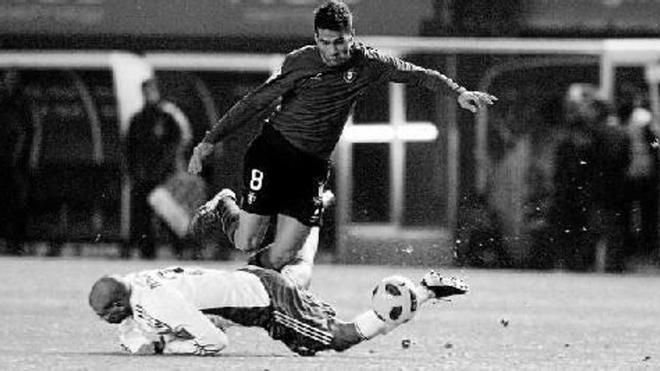 No es habitual ver jugadas tan claras como la que se recoge en la instantánea de arriba, donde se observa cómo el jugador del Zaragoza Diogo derriba desde el suelo a Masoud que se lanzaba sin más rivales cerca hacia el portero. Pero Mateu no pitó al entender que la caída del defensor del Zaragoza fue involuntaria. Foto: j.b./M.s.