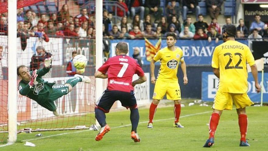 Nino, cabecea a la red el cuarto gol del encuentro ante la estirada de José Juan. Foto: Mikel Saiz