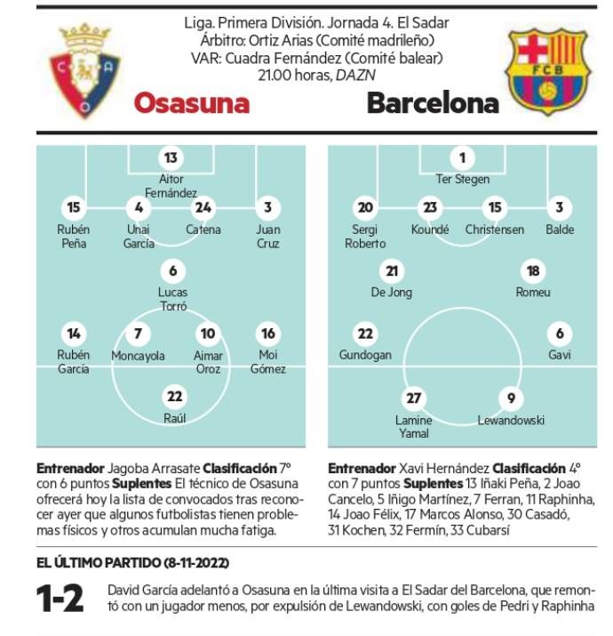 Apenas tres días después de caer eliminado en la previa de la Liga Conferencia a manos del Brujas en su efímero regreso a Europa después de 16 años de ausencia, Osasuna tiene la oportunidad de ahogar sus penas en El Sadar. Eso sí, contra el campeón vigente de la Liga, un Barcelona que llega a Pamplona con sólo un punto más que los rojillos (tras la disputa de las tres primeras jornadas del campeonato), pero después de un último día de mercado muy prolífico en el que inscribió a cinco futbolistas incluidos en la lista de convocados para el duelo de esta noche: los portugueses Joao Félix y Joao Cancelo, el central Iñigo Martínez, ya con el alta médica tras superar unos problemas en la fascia de su pie derecho, el portero Iñaki Peña y Alejandro Balde, que hasta la fecha había jugado con ficha del filial.