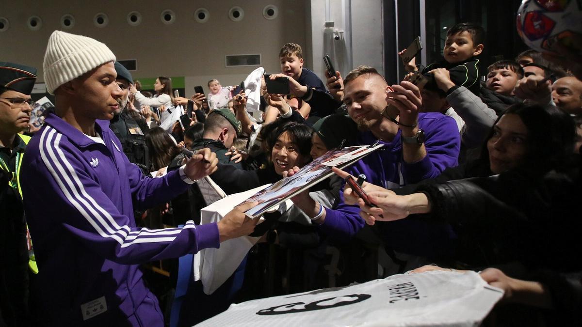 Media hora antes de su llegada al aeropuerto de Noáin, una gran multitud de fanáticos ya se agolpaba aguardando la salida de los jugadores del Real Madrid. Las grandes figuras como Mbappé, Bellingham o Vinicius eran los más deseados por los aficionados, expectantes de recibir el autógrafo de sus ídolos e inmortalizarlo en una foto.