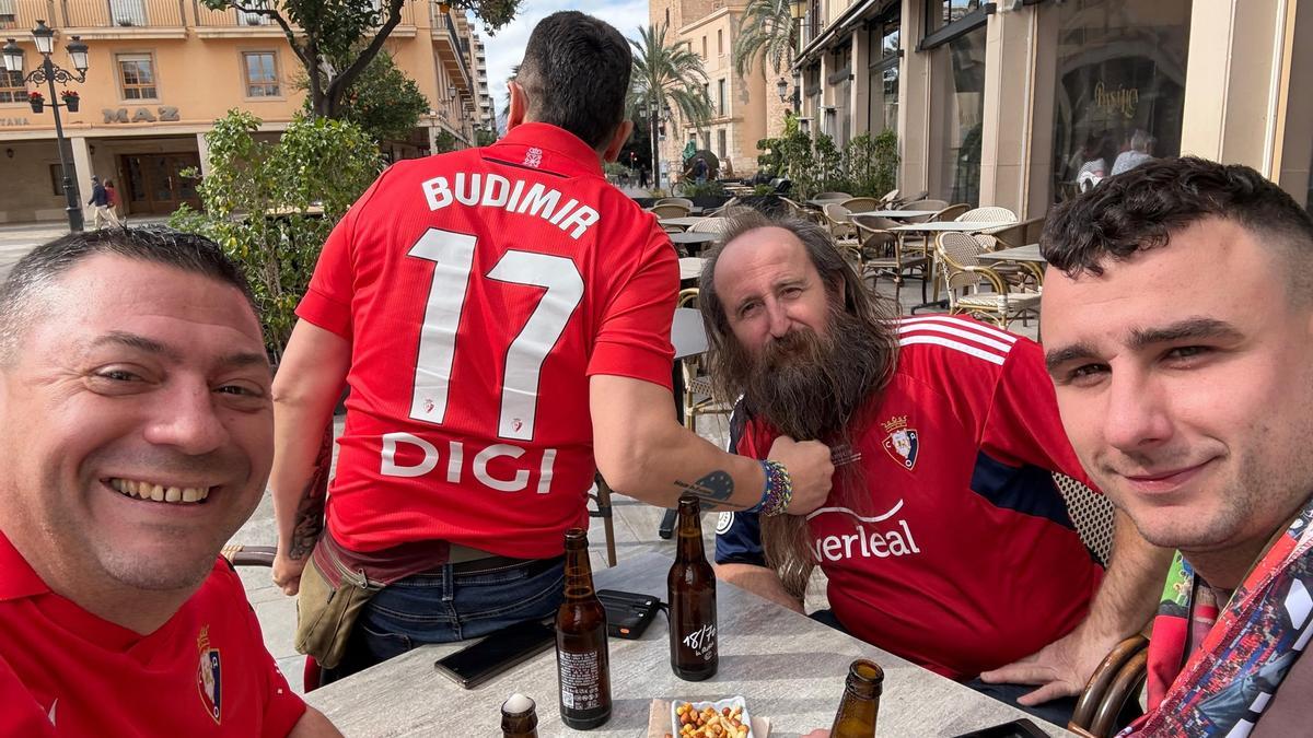 Prometió Panorámix, un habitual en los desplazamientos de Osasuna, acudir a Elche, adonde ha llegado a primera hora de la tarde de este viernes en compañía de Benjamín Rekarte, presidente de la Federación de Peñas de Osasuna, Jose el suizo, miembro de una peña rojilla con sede en Sión, y Xabi, un sobrino de Rekarte.