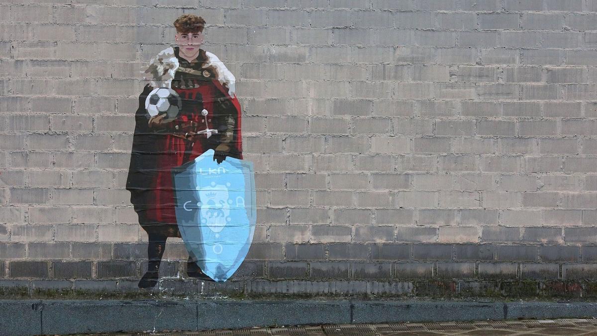 "Víctor Muñoz ha demostrado en muy poco tiempo lo que significa ser fuerte de verdad. Su llegada a la élite no fue fácil. Debutó en Primera División en un escenario enorme, con todo el foco encima, y enseguida fue centro de la crítica. Las redes no perdonan y menos a un chaval que acaba de llegar. Lo que para muchos podría haber sido un golpe definitivo, para él fue solo el principio. En lugar de hundirse, le dio la vuelta. Llegó a Osasuna y explotó", describe el artista, que ha dibujado al jugador a modo de "caballero" con un balón de fútbol en una mano y un escudo de Osasuna en la otra.