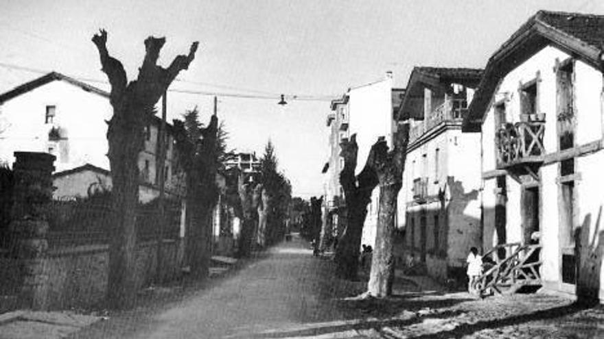 En la fotografía antigua vemos una vista tomada ese mismo año en la calle de Abejeras, cuando era poco más que un camino sin asfaltar, que había estado conformado por casas de campo, chalets y huertas, pero en las que ya empezaban a construirse los primeros bloques de pisos. Vemos la calle flanqueada por aquellos grandes árboles que ornaban las veredas del extrarradio pamplonés de la época, y al fondo se adivinan los pinos que había al inicio de la calle, junto a la actual plaza de los Fueros.
