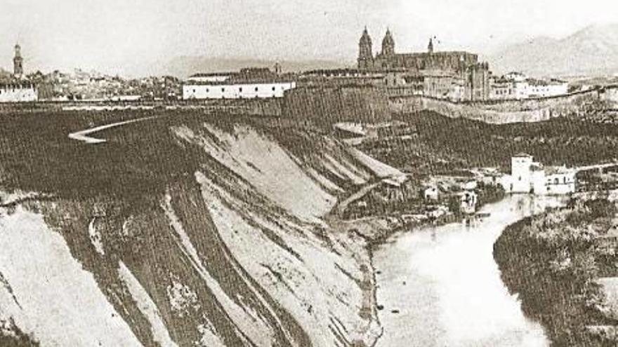 La fotografía, que Arazuri sitúa de manera ambigua en el siglo XIX, sin mayores concreciones, muestra el perfil descollante de la catedral de Pamplona, con sus dos torres tardobarrocas, e inmediatamente debajo la masa oscura del baluarte de Labrit. A su izquierda se aprecia el edificio blanco del convento de la Merced, asomando por encima de la muralla de la Tejería, que seguía el trazado de la actual calle de Juan de Labrit. En la orilla del río, por último, puede verse el antiguo molino de Caparroso, que por entonces mostraba un vistoso revoque blanco, dando frente a las huertas de la Rotxapea.