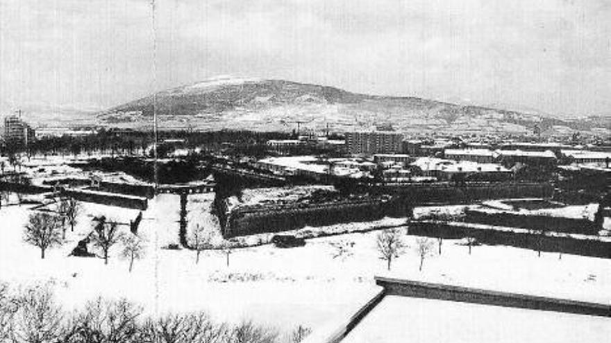 HOY EN DÍA la vista septentrional de la Torre de Huarte es, con mucho, la que menos cambios ha experimentado en los 46 años transcurridos. Vemos, al fondo y a la izquierda, el perfil de la Torre de Erroz, tal y como la veíamos en 1967, y a continuación, justo bajo la cima del monte Ezkaba, el perfil inconfundible del Edificio Singular, que va seguido de los bloques de viviendas que conforman la avenida del Ejército. En el extremo inferior derecho, cierra el plano la terraza inferior de la Torre de Huarte, que aparecía cubierta de nieve en 1967, y que certifica que nos encontramos en el punto exacto en el que Galle se situó para obtener su fotografía hace medio siglo.