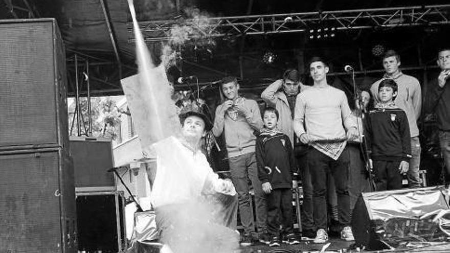 donibane. Balonmanistas de primera división, juvenil y cadete del equipo Helvetia Anaitasuna fueron los encargados de prender la mecha de un cohete pasado por agua en Donibane. “Hemos tenido que suspender algunas actividades por culpa de la lluvia, como la kalejira de los mayordomos en compañía de la Comparsa de Gigantes y Cabezudos”, explicó Koldo Osinaga, de la asociación vecinal San Juan Xar. Foto: Oskar Montero