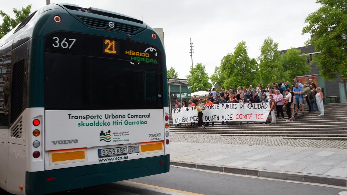 Por ello, miembros de la plantilla de TCC se han concentrado de nuevo este miércoles frente a la sede de la Mancomunidad de la Comarca de Pamplona para reclamar la actualización de los tiempos de recorrido de las líneas.