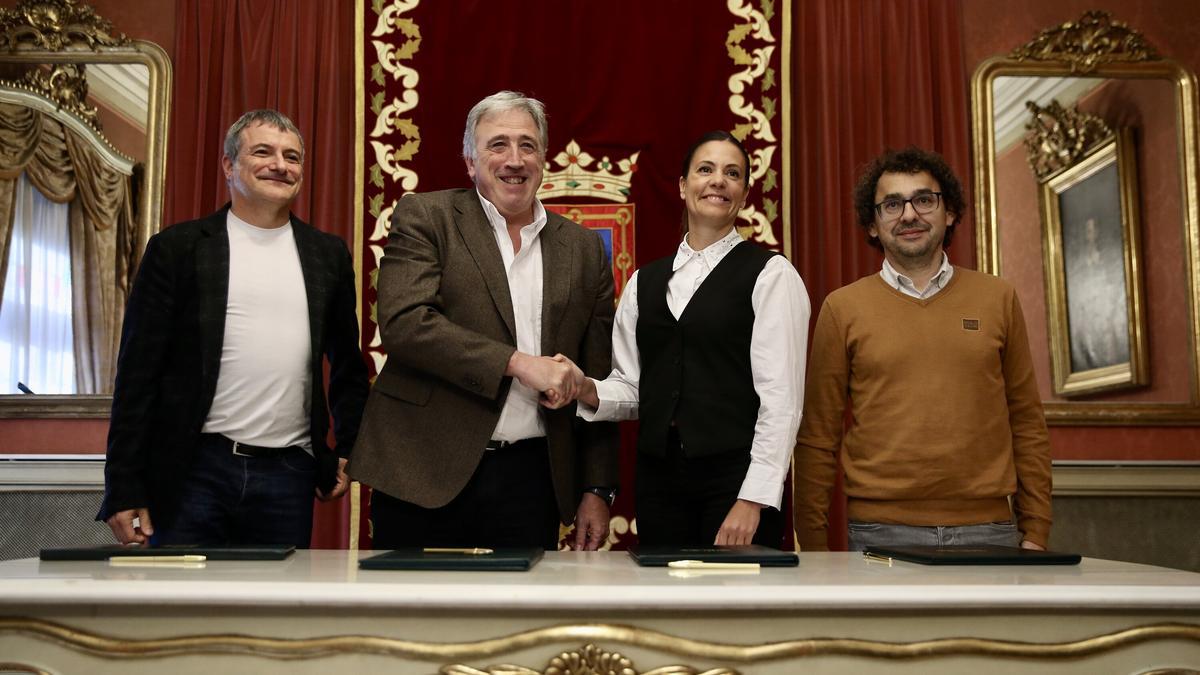 El acuerdo ha sido rubricado este viernes por la mañana en el edificio consistorial en un acto al que han acudido los representantes de los cuatro grupos firmantes; Joseba Asiron (EH Bildu), Marina Curiel (PSN), Mikel Armendáriz (Geroa Bai) y Txema Mauleón (Contigo).