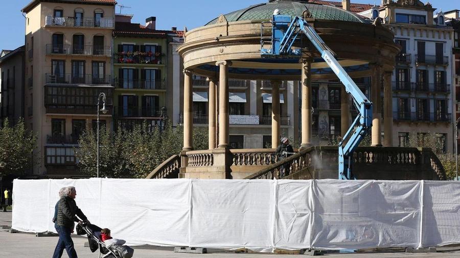 El quiosco de la Plaza del Castillo de Pamplona se ilumina este fin de semana en varios colores por la celebración de tres días internacionales.