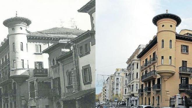 Los chalets que habían poblado el Segundo Ensanche estaban en proceso de eliminación. Se habían construido tras el derribo de las murallas a partir de 1915, y pertenecían a una burguesía, médicos, abogados, comerciantes, que habían querido ser los primeros en abandonar el hacinamiento del casco antiguo cuando se eliminó la obligación de vivir en el interior amurallado. Quedaban aún algunos ejemplares de aquella primera generación de edificios, aunque las piquetas municipales trabajaban a destajo para liberar solares y levantar en su lugar bloques de viviendas. La fotografía nos muestra un tramo de la calle Arrieta, con tres chalets alineados. El primero de la derecha, parcialmente visible y hoy desaparecido, fue propiedad del abogado Salinas Quijada, mientras que el segundo, más bajito y algo retranqueado, es el chalet del doctor Aldaz. A continuación, un imaginativo bloque con torrecilla esquinera de planta circular.