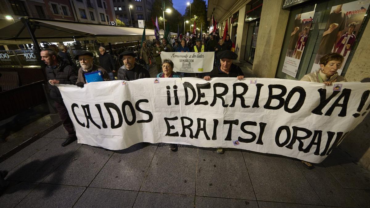 Entre las pancartas se han podido leer lemas como Caídos eraits gazte langileok, Caídos, derribo ya, Gora borroka antifascista o Faxismoa borrokatu. Unas letras que se han sumado al cántico general “Udala entxun: Caídos pim pam pum, no hay más solución, demolición”, que ha resonado una y otra vez.