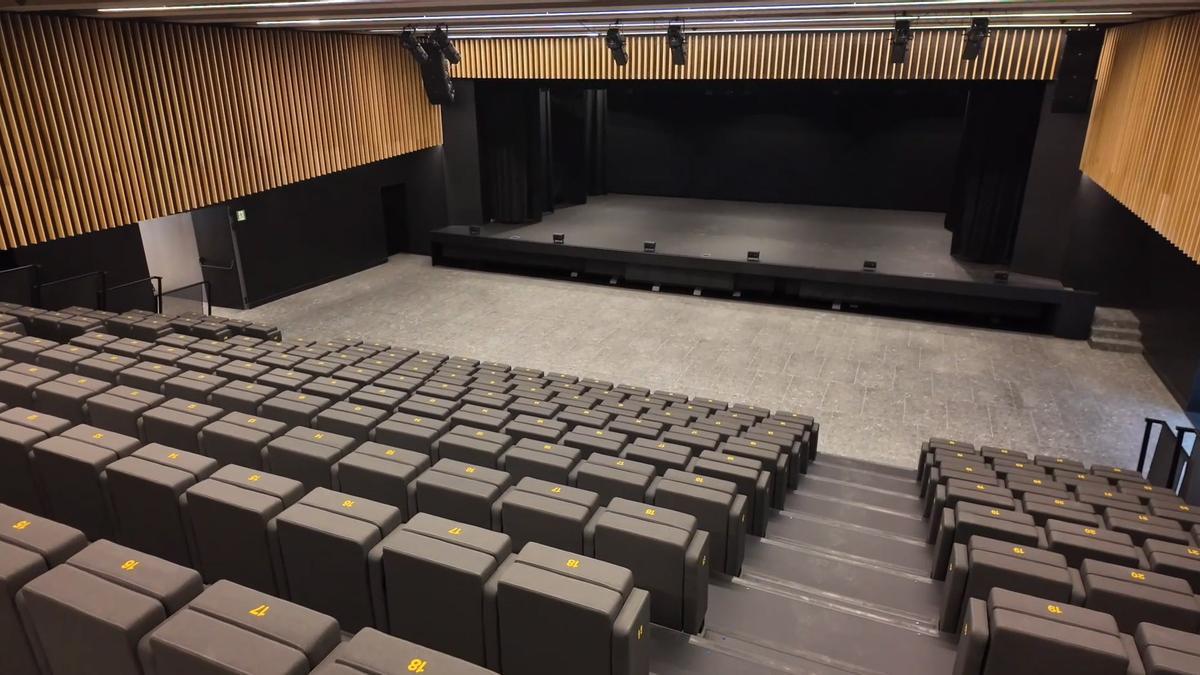 Sin duda, el auditorio que alberga es una de las apuestas principales de este inmueble. De 19 x 17,40 metros, y 5,80 metros de altura, el auditorio tiene capacidad para 402 personas, gracias a una grada telescópica de 253 butacas y unas primeras filas de asientos apoyados en el suelo, que pueden ser desplazados o eliminados para diferentes configuraciones de la sala. Todo ello, permite adaptar el espacio a distintas actividades y propuestas culturales, desde teatro a conciertos, pasando por charlas y eventos con el público en pie.