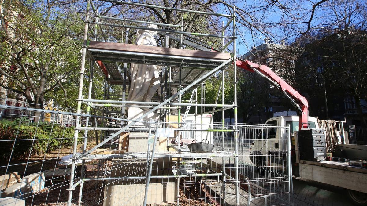 La previsión que manejan el Ayuntamiento de Pamplona y la empresa Sabbia Conservación y Restauración SL, que realiza el traslado, es que para el inicio de la Navidad no haya ninguna estatua en el paseo de Sarasate. Desde el pasado mes de septiembre, se han ejecutado los trabajos de limpieza y de restauración, además de los trabajos preparatorios para el traslado a la Taconera.