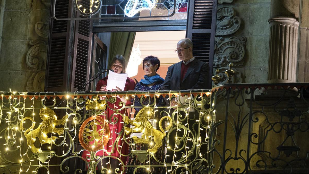 La tradicional lectura del Pregón que anuncia las fiestas de Navidad en Pamplona ha rendido homenaje esta tarde a las personas voluntarias que ofrecen su ayuda en el Teléfono de la Esperanza. La presidenta de la entidad en Navarra, Begoña Arbeloa García, ha iniciado la lectura, acompañada por el voluntario Luis Royo Moya y la voluntaria Natalia Regueras Villanueva. Este año se cumplen 25 años de la cena de Nochebuena que organiza el Teléfono de la Esperanza para acompañar a personas que estén solas en estas fechas.