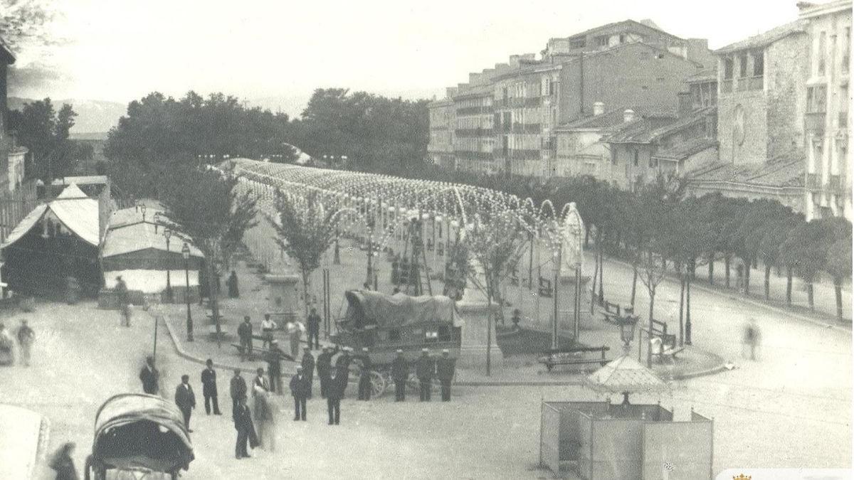 Poco a poco el paseo iba tomando protagonismo como espacio para el ocio y la fiesta. Durante los Sanfermines la Casa de Misericordia ponía en sus aledaños varias carpas o casetas con distintas atracciones: puestos de bisutería, quincalla, baratijas y tejidos, churrerías, etc. Era el germen del recinto ferial de atracciones, las populares barracas que, aunque en distintas ubicaciones de la ciudad, aún hoy en día siguen colocándose durante las fiestas, con gestión de la misma institución benéfica. Además, por iniciativa de la Comisión Municipal de Iluminaciones, se decidió adornar el paseo para los Sanfermines de 1884 con un túnel luminoso a todo lo largo del andén central. Montado por Vicente López de Goicoechea, constaba de 7.609 lámparas de gas, con sus correspondientes tulipas de porcelana, montadas en arcos apoyados en casi cien postes de chopo. El coste del montaje fue de 8.438 pesetas y cada atardecer de aquellos días festivos se debían encender, laboriosamente, las lámparas una por una. Una de las noches hubo una gran tormenta que causó muchos desperfectos en la instalación, rompiendo más de la mitad de lámparas y tulipas, y tuvo que suspenderse el encendido varios días.