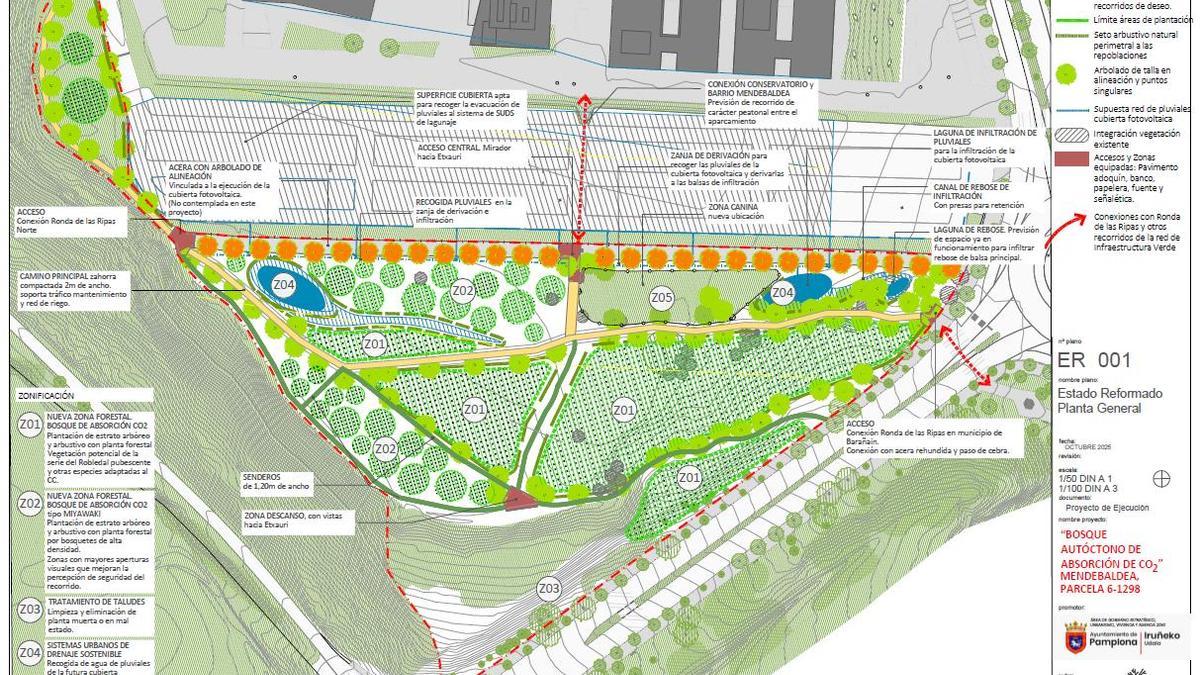 Las dos últimas intervenciones han requerido una inversión de algo más de 500.000 euros. La apuesta de Pamplona por un proceso general de naturalización y, específicamente, por aumentar sus bosques parte de la base de que la captura de carbono de la atmósfera contribuye a reducir el calentamiento global y mitigar el cambio climático. Pero, además, el bosque ofrece otros servicios ecosistémicos adicionales, como la mejora del hábitat y recuperación de la biodiversidad; mejora en los servicios de regulación de la calidad del aire, del ciclo del agua, recarga del acuífero y disminución de escorrentías; mejora del uso recreativo y didáctico del espacio; y mejora paisajística del entorno.
