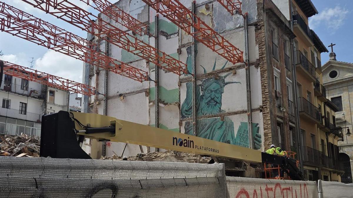 El derribo de un edificio es un puntazo difícil de desaprovechar. Como una volea a media pista con el rival vencido. El tenista de Krakovia ha vuelto a aparecer. Esta vez en las cuatro plantas del bloque de la calle Descalzos 57, donde el Ayuntamiento va a levantar la primera promoción de VPO en el Casco Viejo de Iruña. Antes de que esas viviendas sean una realidad, en el lugar se ha colado la Estatua de la Libertad.