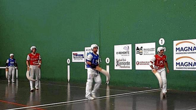 Empezó bien la tarde para los colorados con un 5-0, pero Matxin III y Agirrezabala pusieron a funcionar la maquinaria para empatar a seis y reconducir el marcador. Con tantos peloteados, los delanteros comenzaron a afinar en sus remates aunque no conseguían distanciarse (empates a 11, 13, 14, 15, 16, y 17). Tras otra fase de alternativas, una tacada de los azules les colocó 31-34, acariciando el triunfo, pero les tocó sufrir hasta el 33-34, tanto que se llevaron los azules para certificar su victoria.