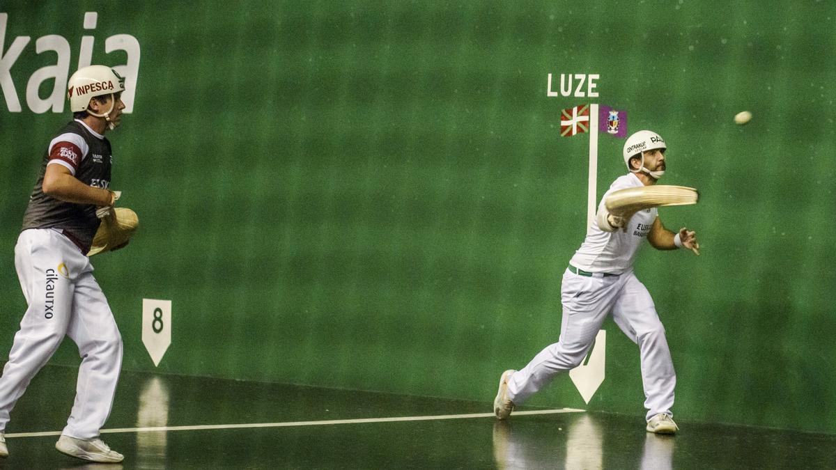 Aritz Erkiaga se ha encargado de salvar los muebles para la representación local en la primera tanda de finales de la Liga de Naciones de frontón de 36 metros que se celebra durante esta semana en territorio vizcaino. La derrota encajada en el choque decisivo de pala corta -ante Francia- celebrado poco antes en el frontón Bizkaia incrementaba la presión sobre lo que debía acontecer en Barakaldo, donde se disputaban las dos finales de cesta individual. La primera, como cabía prever, caía del lado español, gracias a la victoria en dos jokos de Erika Mugartegi sobre Ihart Arakistain en categoría femenina. En esas circunstancias, el peso de responsabilidad crecía sobre las espaldas de Erkiaga, que carecía de margen de error si no quería complicar en exceso el triunfo de Euskadi en el medallero global de la competición. El delantero de Ispaster no se ha amilanado y ha batido con suficiencia al francés Jean Olharan (15-6 y 15-10), logrando así el primer oro para la selección vasca, tras una jornada aciaga agudizada además con la grave lesión del palista Imanol Ibáñez.