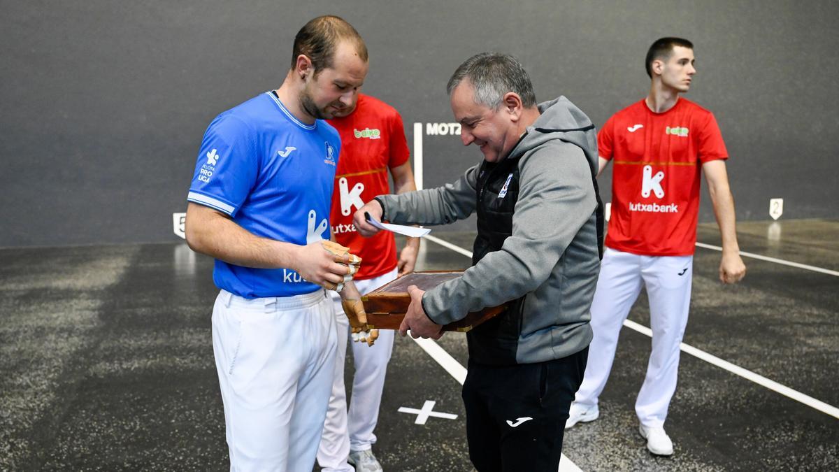 “El material es bastante bueno. No es de mucha salida ni de mucho bote, pero son pelotas buenas”, decreta Martxel Iztueta, el más joven de la fase final de la competición, con apenas 22 años cumplidos a principios de febrero. Pese a la irregularidad, está rindiendo a buen nivel. “Al principio del campeonato, tuve problemas de manos, pero ahora estoy bien, aunque quizás algo más justo de chispa”, explica.