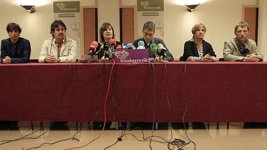 Rufi Etxeberria y Maribi Ugarteburu (izquierda abertzale); Peio Urizar (EA) y Oskar Matute (Alternatiba) han sido algunos de los representantes de las tres sensibilidades políticas que han comparecido en la capital donostiarra, "no como Bildu", sino como firmantes en enero del documento "Euskal Herria Ezkerretik", en el que se comprometen a colaborar para conseguir la "soberanía de Euskal Herria" desde el rechazo a las "estrategias violentas".