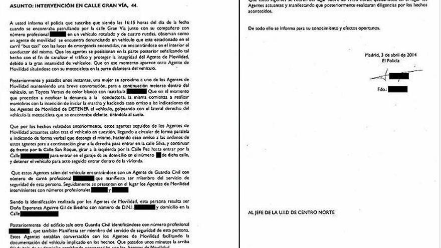 MADRID. El parte de la Policía Municipal de Madrid sobre el incidente que tuvo ayer la expresidenta regional, Esperanza Aguirre, revela que los agentes que le persiguieron hasta su casa llegaron a circular "de forma paralela" junto a su coche pero que ella hizo "caso omiso" a sus indicaciones.