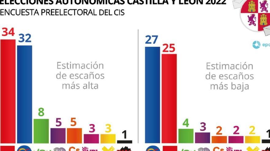 La encuesta publicada este miércoles por el Centro de Investigaciones Sociológicas (CIS) sitúa al PSOE con una estimación de voto del 30,8 %, un punto por encima del PP (29,8 %), y marca unas amplias horquillas para el reparto de procuradores autonómicos.