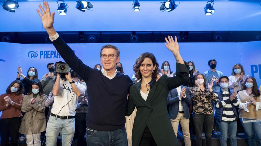 La presidenta de la Comunidad de Madrid, Isabel Díaz Ayuso, y el presidente de la Xunta, Alberto Núñez Feijóo, han exhibido gran sintonía este martes, con elogios y piropos mutuos, durante un acto en Madrid en el marco de la gira que ha iniciado el mandatario gallego para explicar su proyecto a los afiliados.