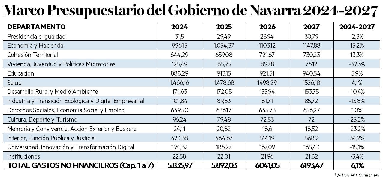 Es el esquema que ofrece el marco plurianual 2024-2027. Un documento aprobado por el Gobierno foral a principios de julio, pero cuyos indicadores principales se han mantenido ocultos hasta ahora. El Ejecutivo había rechazado darles publicidad, hasta el punto de que la nota de prensa en la que se daba cuenta de su aprobación omitía los datos principales para dar una imagen de normalidad que, como se ha comprobado ahora, no es tal.