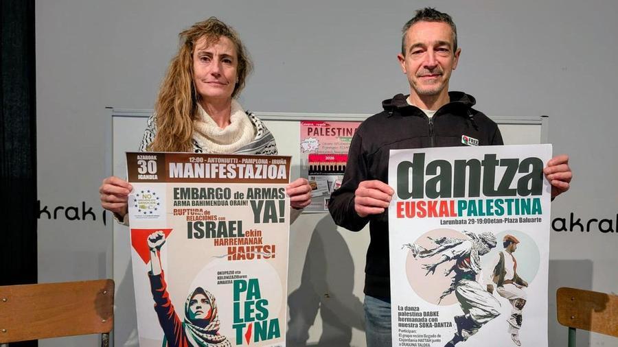 Soriano ha anunciado la visita "muy especial" del grupo de danzas Hattah desde Cisjordania, que va a realizar un hermanamiento con el grupo Duguna y que portará la bandera palestina en la manifestación del domingo. "Nos gustaría resaltar el valor de esta visita no solo por el apartheid y la ocupación que vive a diario el pueblo palestino desde hace 78 años, sino por las dificultades que impone el Estado de Israel a la población de Cisjordania para viajar a otros países, así que nos gustaría hacer un llamamiento a toda la población navarra para que se acerquen a mostrar su cariño y solidaridad hacia este grupo que representa a la resiliente población palestina", ha explicado.