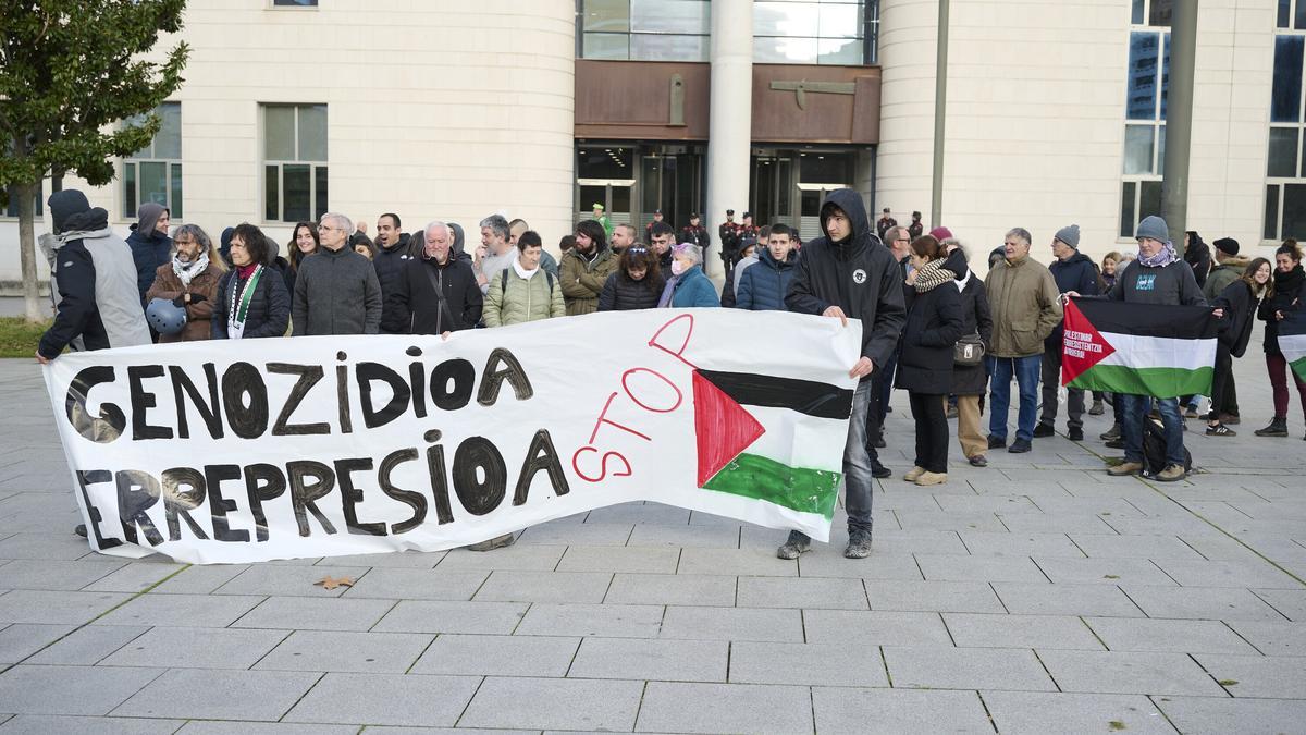 Durante la concentración se ha desplegado una pancarta con el lema "Genozidioa eta errepresioa stop" ("Alto al genocidio y a la represión"), y se han coreado consignas como "Israel boikota!" ("¡Boicot a Israel!"), "Palestina askatu!" ("¡Liberad Palestina!") y "Nafarroako Gobernua konplizea!" ("¡El Gobierno de Navarra es cómplice!").