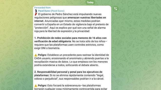 Para el fundador de Telegram, estas medidas podrían convertir a España en un Estado de vigilancia bajo el pretexto de "protección". De esta manera, ha señalado que prohibición de redes sociales para menores de 16 años con verificación de edad obligatoria requiere que las plataformas usen controles estrictos, como exigir DNI o biometría.