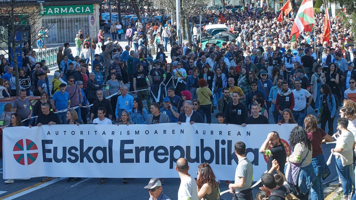 Le seguía una pancarta con el lema 'Autoritarismoaren aurrean. Euskal Errepublika' (Frente al autoritarismo. República vasca) portada, entre otros, por representantes de EH Bildu como su secretario general, Arnaldo Otegi, la coordinadora en Navarra, Miren Zabaleta; el alcalde de Pamplona, Joseba Asiron; o el portavoz en el Parlamento Vasco, Pello Otxandiano.