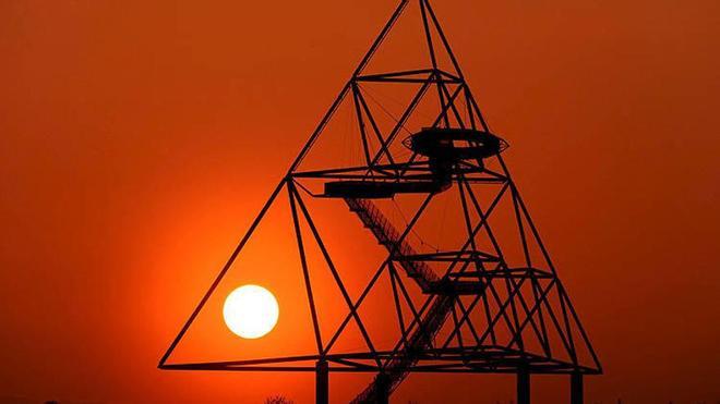 El atardecer ilumina el Tetraedro de Beckstrasse, escultura transitable construida sobre la antigua escombrera de la ciudad de Bottrop (Alemania). Esta construcción de acero de 50 metros de altura es uno de los reclamos de la capitalidad cultural europea que ostenta la región del Rurh durante 2010.