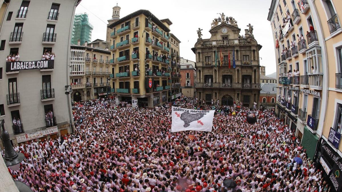 Ni la lluvia que ha estado cayendo en las últimas horas en la capital navarra ni las informaciones que hablan de una circulación muy alta de covid-19 en Navarra han podido con las ganas de fiesta visibles en una plaza Consistorial, abarrotada, y en los aledaños del Casco Viejo, donde se ha vivido con emoción el inicio de 204 horas ininterrumpidas de fiesta, del 6 al 14 de julio.