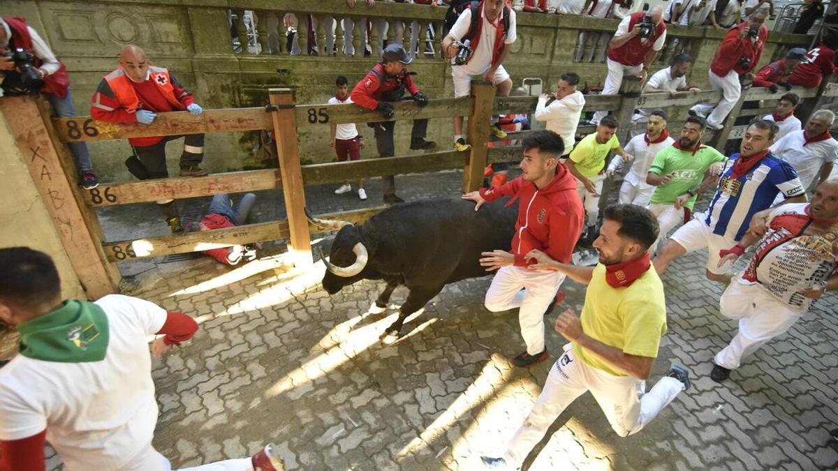Eso es lo que le ocurrió al fotoperiodista Ivan Benítez. En su puesto desde la bajada del callejón, y momentos antes del paso de los bureles, la llegada de varios mozos, que han caído y han dejado un pequeño conato de montón, le han hecho precipitarse hacia el interior del recorrido, provocándole la fractura de dos costillas.