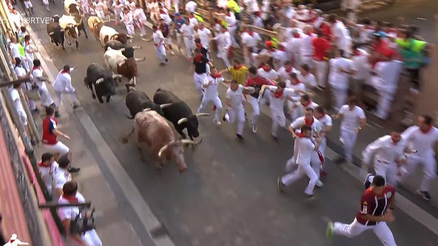 Al comienzo de la Estafeta la manada se ha partido en dos, con los tres toros y el cabestro por delante y el resto por detrás, con una separación de unos diez metros después de una caída al principio de la calle que ya hizo imposible que los dos grupos de toros pudieran unirse.