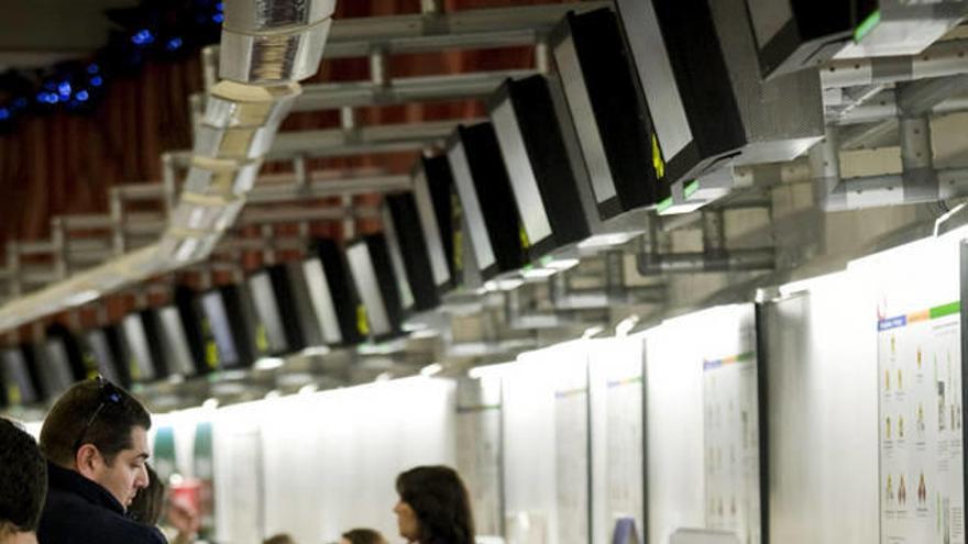 En el aeropuerto de Madrid comienzan a verse menos aglomeraciones, mientras los pasajeros van facturando poco a poco y dirigiéndose a las zonas de embarque.