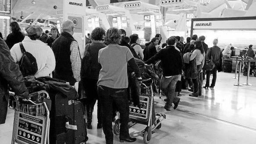 Vanesa Barruti es argentina. Hace ocho meses que nació su hijo, Sebastián, y fue entonces cuando compró los billetes de avión para viajar a Buenos Aires con su marido, Raúl Marín, con el propósito de que su familia conociera al pequeño. "Todavía no le han visto", decía Vanesa dolida. La huelga traidora de los controladores ha hecho que en Argentina tengan que esperar aún más para abrazar por primera vez a Sebastián. Vanesa y Raúl aguantaban estoicos en la fila rodeados de maletas. "Visto el plan, no salimos ni hoy ni mañana", afirmaba Raúl. "Llevamos en la cola dos horas y hemos avanzado 15 metros", añadía. "A ver si esta gente se apiada y decide levantar la huelga", suspiraban ante su situación, que se antojaba compleja, ya que habían viajado desde La Rioja para embarcar en Madrid rumbo a Buenos Aires.