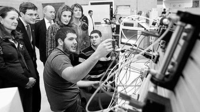 La presencia de la princesa en cada aula era fugaz, pero tal y como aseguró Txuma Garde, del CIP Virgen del Camino, "ha sido una experiencia diferente. Este joven de 31 años, que ha vuelto al mismo grado formativo que dejó por la crisis, junto a sus compañeros David Muñoz, Iñigo Irisarri yDarío Prados le explicaron cómo se fabrica una pieza de un torno mediante ordenado. Por su parte, los ocho alumnos del PCPIE de la Escuela Sanitaria realizaron una demostración de cómo se realiza una reanimación cardiopulmonar. "Estamos un poco nerviosos pero espero que nos salga bien", afirmaban Jon Vázquez y Sara Aranguren, de 19 años, que ahora harán las prácticas del ciclo formativo (ella en el hospital y él en un laboratorio). Su compañero Manuel González reconcía orgulloso que "Letizia nos ha dado la mano". Los elegidos para participar en la reunión que mantuvieron sobre la situación de la FP en Navarra fueron Leire Santos y Javier Carmona. "Ha sido una experiencia muy bonita en la que hemos tenido la oportunidad de resumir lo que ha sido su trayectoria como alumnos en una charla amena", explicó Santos. Su compañero añadió "no todos los días se tiene la oportunidad de conocer a gente de tan altas esferas, por eso agradecemos esta visita en pro de la FP".