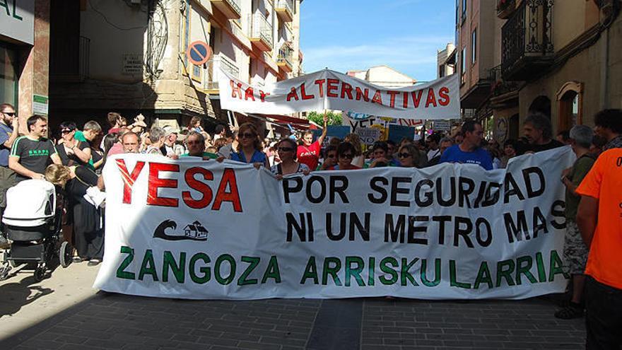 Anunciada por varios cohetes, la manifestación partió de El Prau encabezada por miembros de la iniciativa, entre ellos, Luis Sola e Iker Aramendía, los concejales de la Agrupación Progresista de Sangüesa, Cristina Gil y Antonio Miguéliz, la alcaldesa de Gallipienzo, Karmele Iriguibel y el alcalde de Artieda de Aragón, Javier Jiménez, que portaban la pancarta con el lema "Yesa por seguridad, ni un metro más. Zangoza Arriskularrian", Sangüesa en grave peligro".
