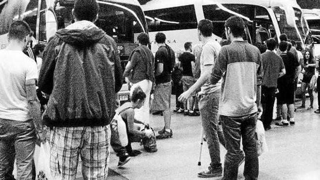 Cuatro autobuses en fila, gente agolpada contra la puerta pegando codazos para lograr entrar los primeros. La gente accede al autobús como puede, de uno en uno, tal y como exige el chófer para poder comprobar los billetes. Las ansias por llegar a casa, después de una noche de juerga, queman la paciencia de los juerguistas que pelean e intentan colarse los primeros en el autobús.
