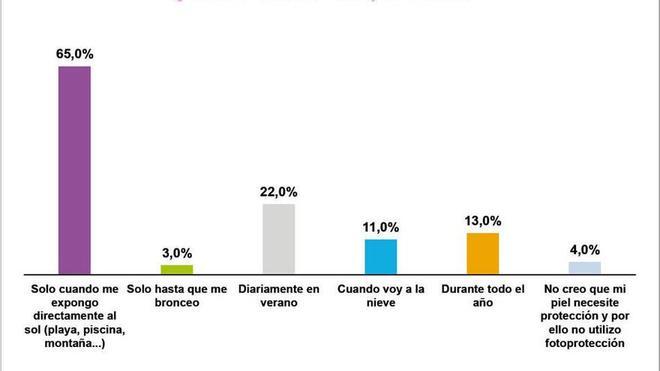 Además de usar crema fotoprotectora (69%), evitar el sol en las horas centrales del día (49%), protegerse con ropa o gafas de sol (26%) y permanecer en la sombra o debajo de la sombrilla (24%) son el resto de medidas recomendadas por los dermatólogos con que los encuestados de esta comunidad afirman protegerse de los rayos solares.
