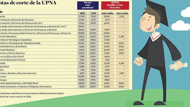 Desde la Oficina de Acceso de la UPNA explican que, hasta el momento, el proceso sigue un ritmo similar al de anteriores años, aunque sí se ha percibido un nivel algo superior, en general, en las notas de corte. Comparando el balance con el del pasado curso a estas alturas (cuando se publicó la tercera lista), de las 22 titulaciones, únicamente en cinco de ellas se exigió en 2015 una nota superior.