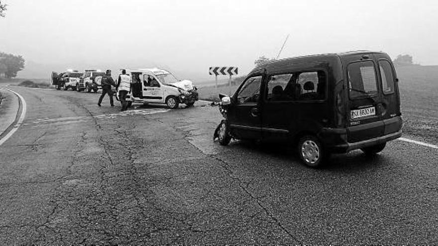 choque frontal. Cuatro personas tuvieron ayer que ser trasladadas en ambulancia al Complejo Hospitalario de Navarra con heridas de diversa consideración después de que dos furgonetas colisionaran frontalmente en el término municipal de Artajona. El accidente ocurrió en el kilómetro 13 de la NA-6030 (Mendigorría-Tafalla) y dos patrullas de la Guardia Civil acudieron al lugar del siniestro para socorrer a las víctimas. El siniestro ocurrió por la mañana y en ese momento había niebla y llovía con relativa intensidad en la zona. Foto: D.N.