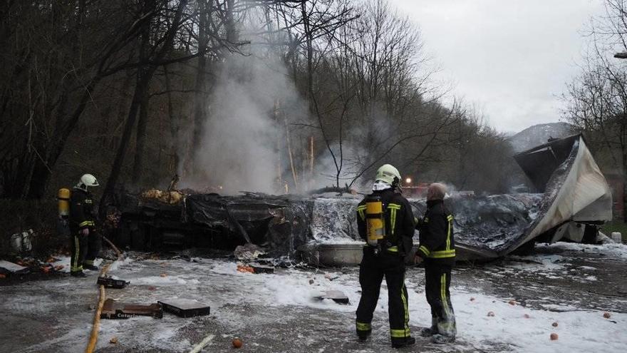 Fuentes del Servicio de Emergencias explicaron que, a consecuencia del golpe, la cabina se partió, se separó del remolque y quedó empotrada en una zona de árboles, mientras que el remolque continuó varios metros más y se calcinó.