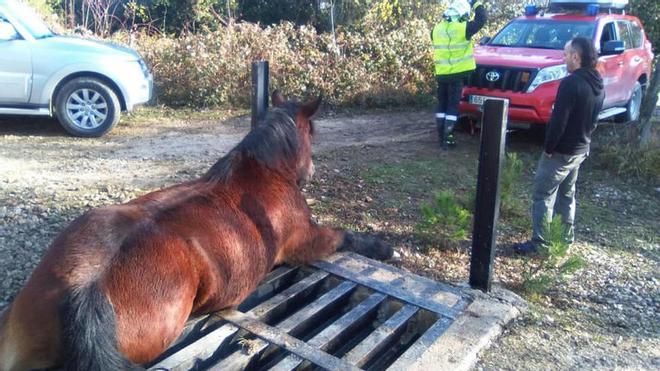 Pamplona. Los bomberos de Navarra han rescatado a una yegua que había quedado atrapada en un paso canadiense en una pista de Iratxeta. El animal tenía las dos 2 patas traseras encajadas en la estructura.