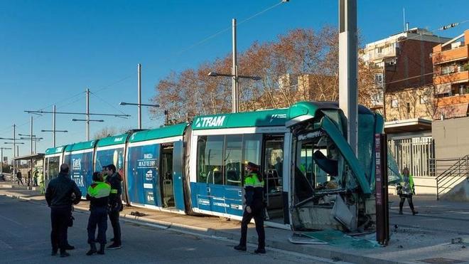 Los responsables del TRAM Barcelona investigan las causas del accidente y los motivos por los que el tranvía no ha frenado cuando ha llegado al final de la línea T4, que se encuentra junto a la estación de trenes de Cercanías de Sant Adrià de Besòs.