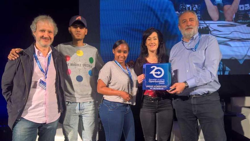 PAMPLONA. Fundación Ilundain Haritz Berri se ha convertido en la primera entidad social navarra reconocida dentro de la Asociación de Escuela de Segunda Oportunidad (E2O). Esta distinción se hizo pública este miércoles en Madrid, en el IV Encuentro Nacional de E2O. Jesús Mª Arbea Polite, Jefe de Sección de Planificación, Ordenación y Desarrollo de Formación Profesional de Gobierno de Navarra, hizo entrega en ese acto a Francisco Javier San Martín Arbilla, director gerente de Fundación Ilundain, de la placa que distingue como nueva Escuela de Segunda Oportunidad. Desde la entidad social también acudieron al acto Arantza Gómez, técnica de E2O, Ainara Arriaga, docente de FP Básica en Ilundain, así como Brignit Bonifacio y Abdul Hannan en representación del alumnado.